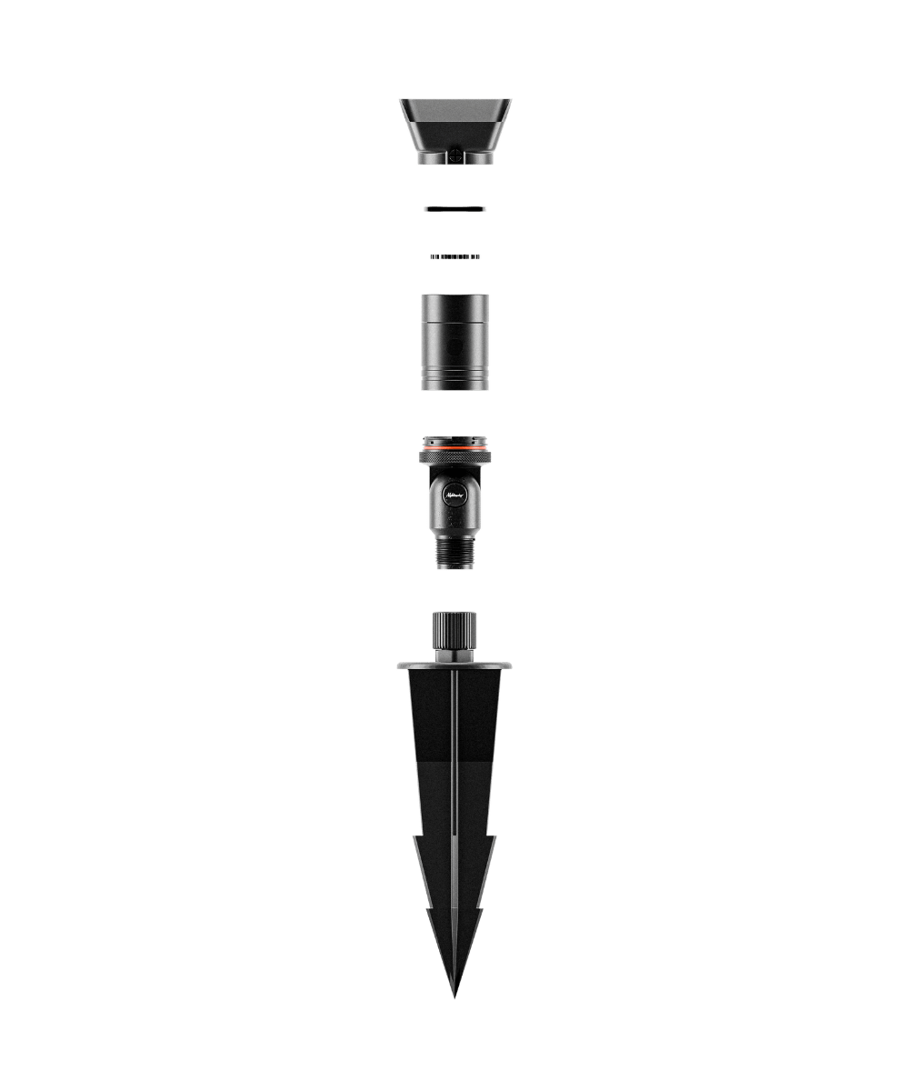 Modular fixture designed for fast, wire-free installation in softscape environments. ABS stake base provides strong in-ground anchoring.