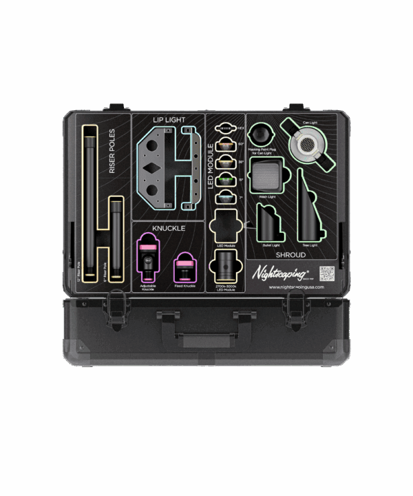 Foam-cut compartments hold LED modules, knuckles, shrouds, risers, power bases, mini battery-powered transformer, and lenses in place during transport.