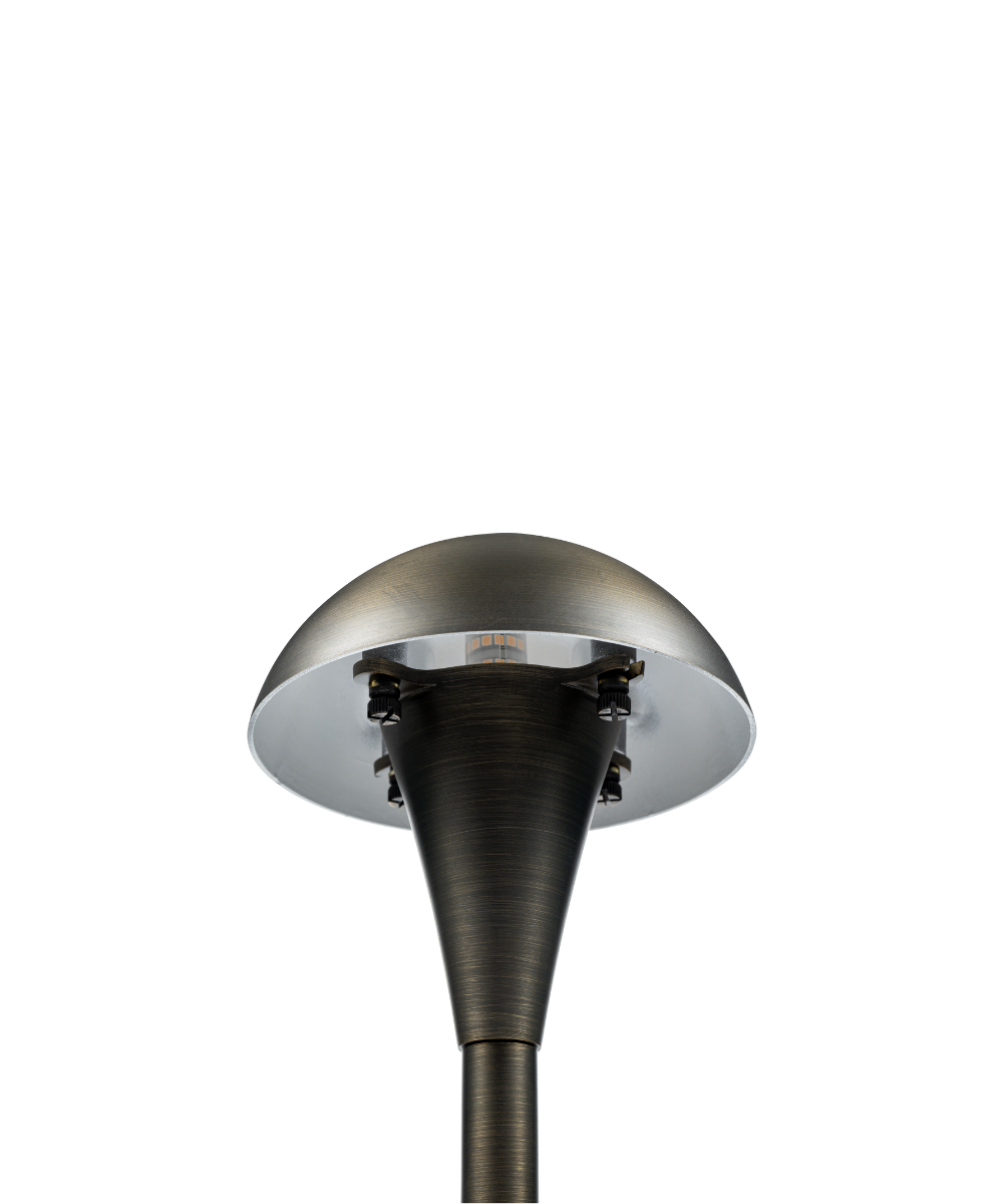 The Luxembourg Sidera Series G4 bi-pin, LED, drop-in luminaire by Nightscaping® is ideal for illuminating pathways and raised garden beds. The Luxembourg luminaire is a solid cast brass path-light that is short in stature which allows it to blend seamlessly into the landscape. The cast brass hat with reflective white powder-coated interior helps the fixture to illuminate almost any garden area.