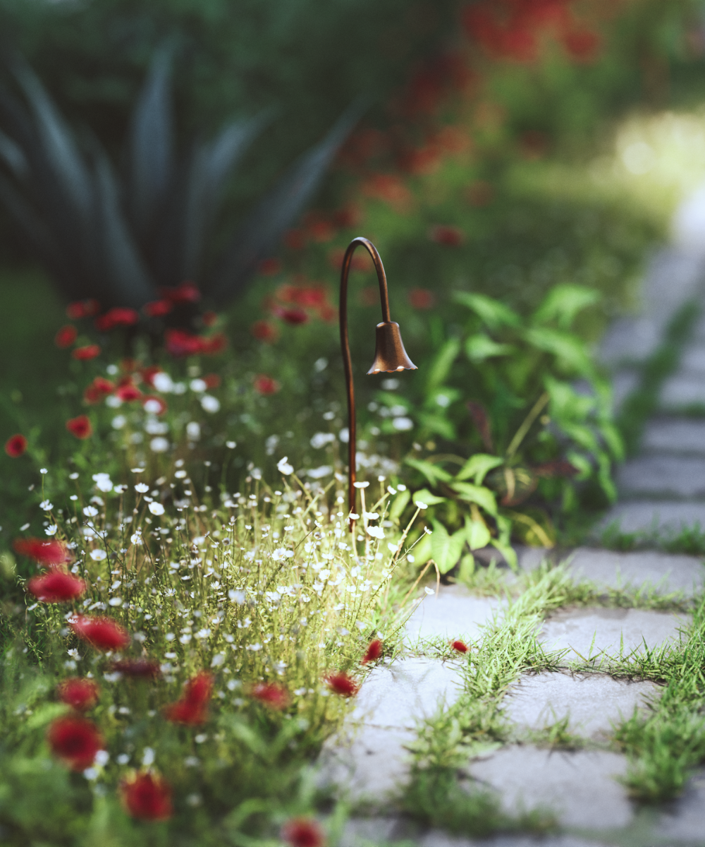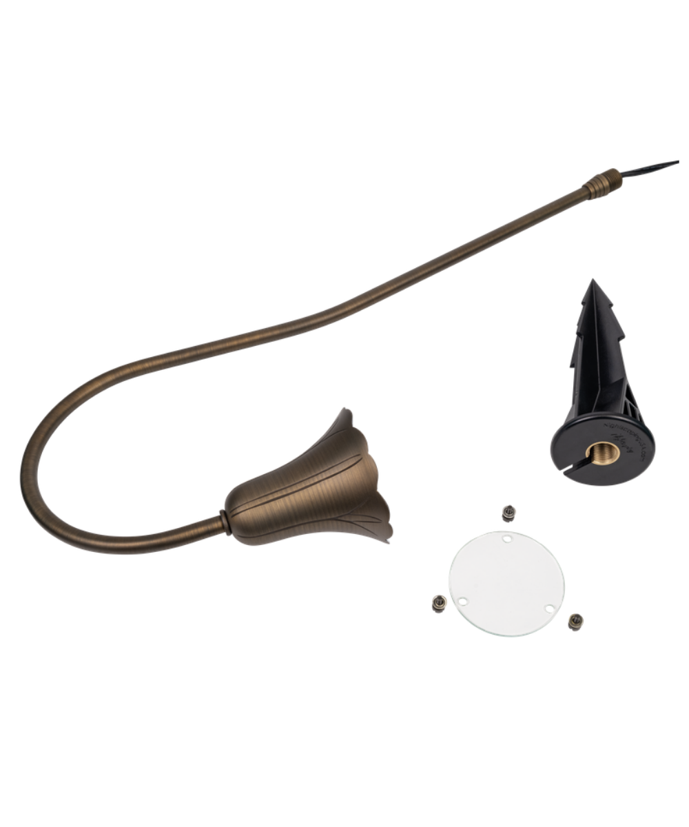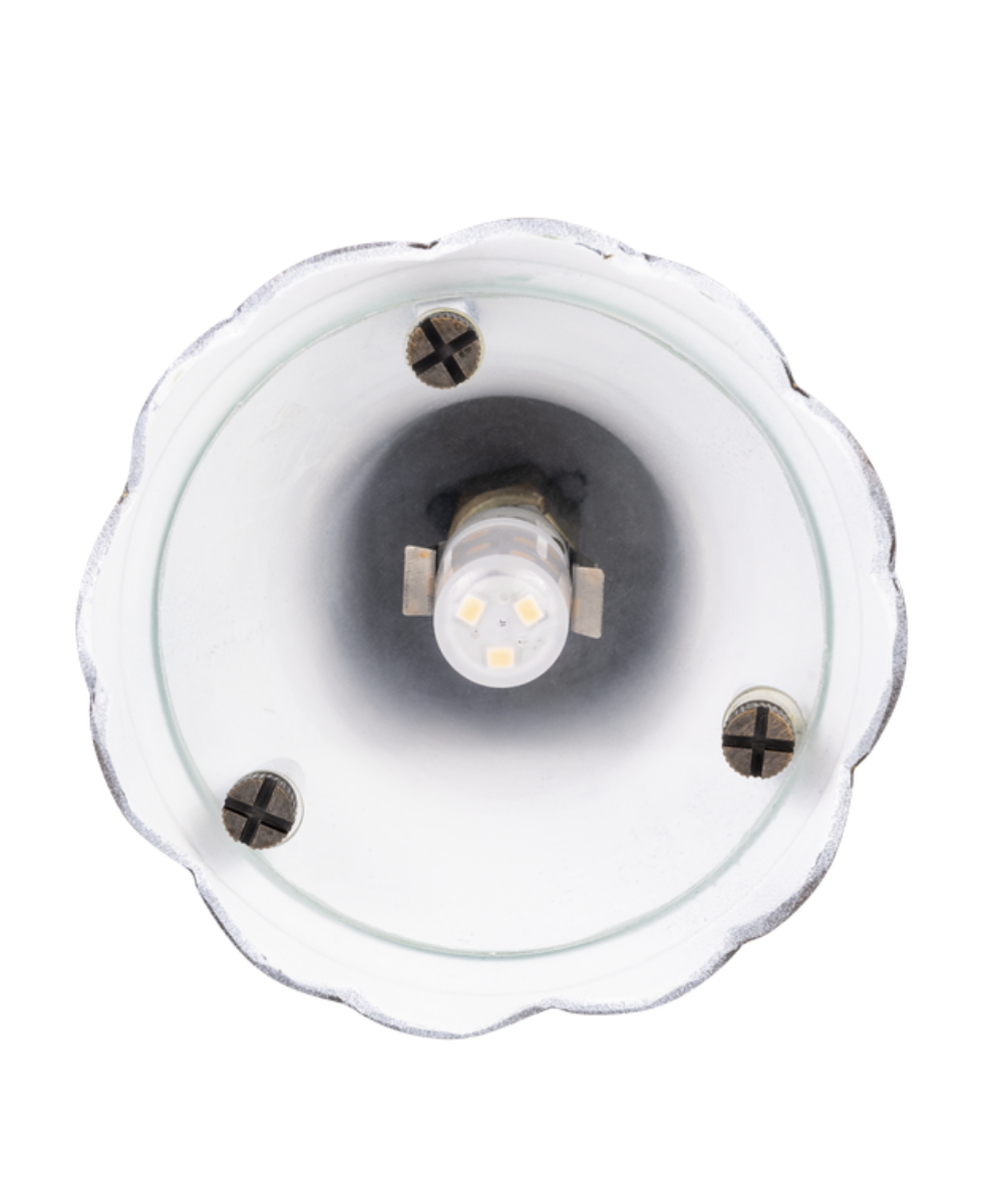 The Sofia Sidera Series G4 bi-pin, LED, drop-in luminaire by Nightscaping® is ideal for illuminating pathways and walking areas. The Sofia luminaire is a tulip shaped cast brass path-light that has an enclosed socket. The brass hat with reflective white powder-coated interior helps the fixture to illuminate almost any garden or walking area.