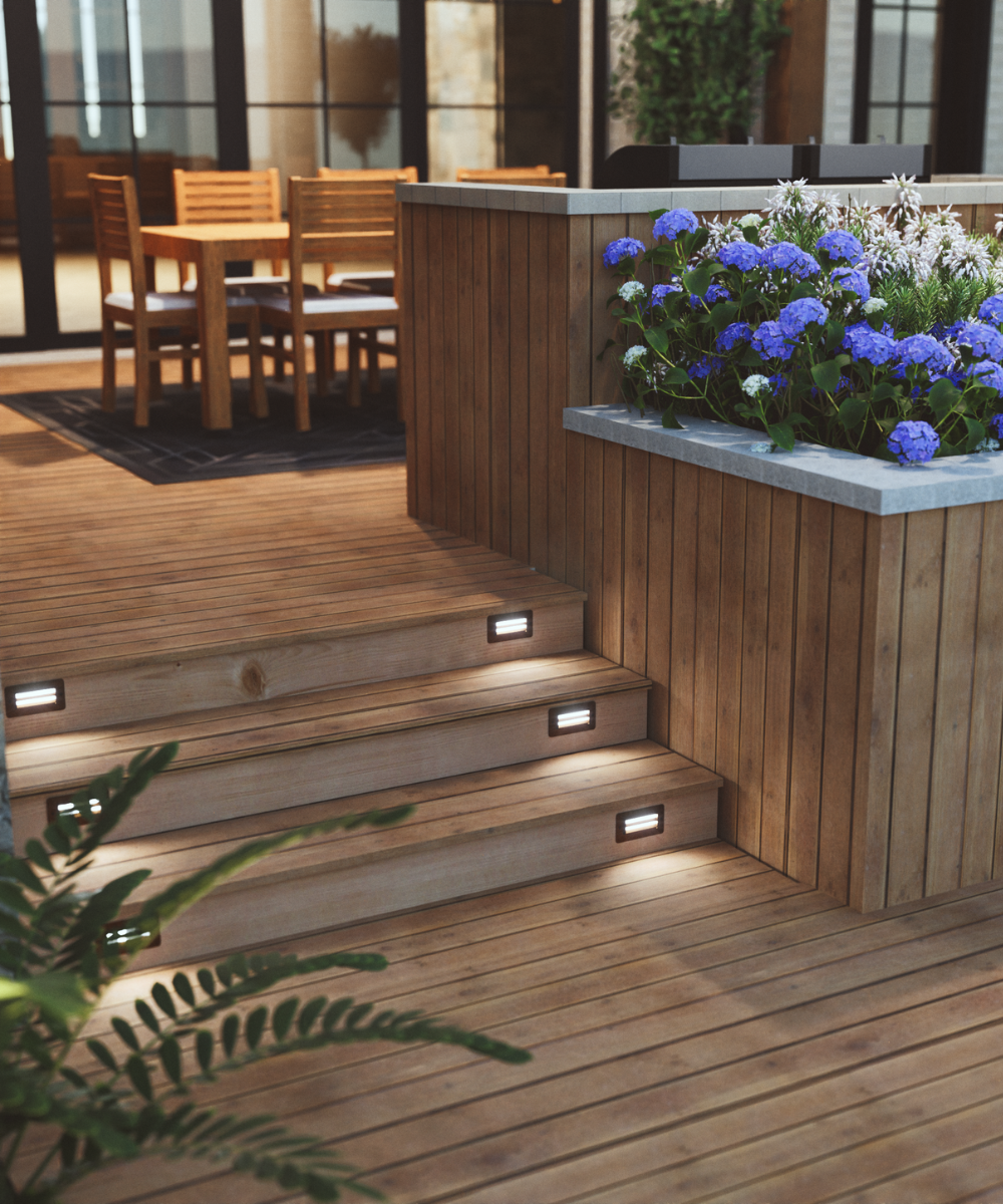 The Avondale Sidera Series G4 bi-pin, LED, drop-in luminaire by Nightscaping® is ideal for illuminating steps on decks, docks and patios. The Avondale luminaire is an 5” solid cast brass luminaire that is installed to sit flush into any hardscape or wood surface. The Avondale has a louvered brass cover plate to help protect the glass lens from high traffic areas like stairs and steps.