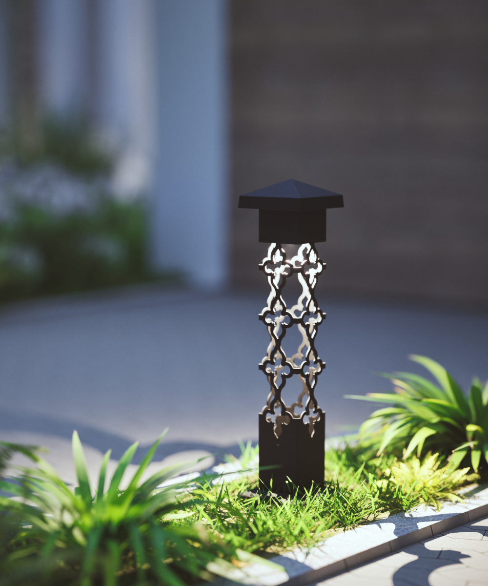 The Nightscaping® Cross design bollard is ideally suited for semi-formal and orderly gardens where a classic, symmetrical pattern is desired. Drawing its interpretation from the French fleur-de-lis pattern, the shadows emitted from this fixture form a stunning chain of interlinking shadows surrounded by light.